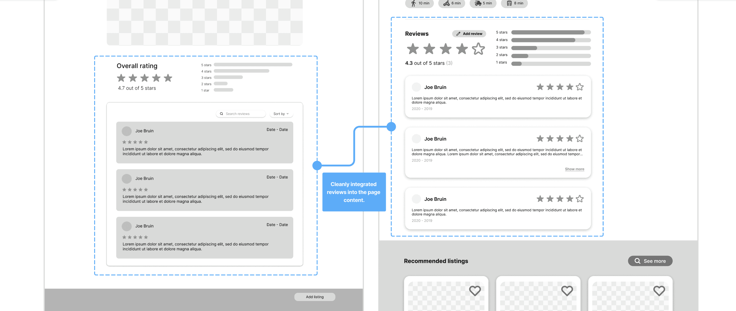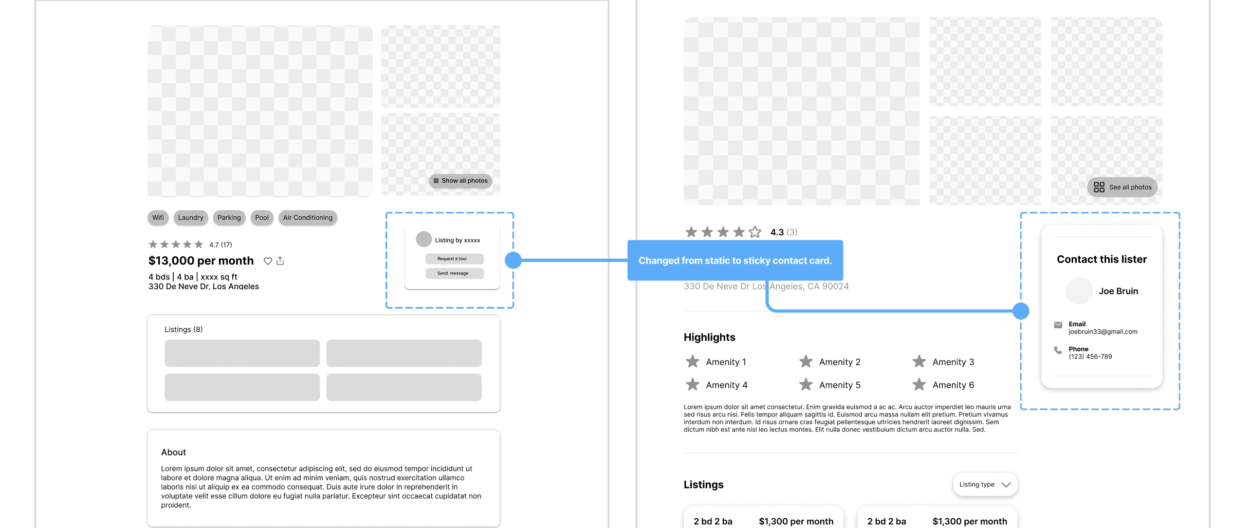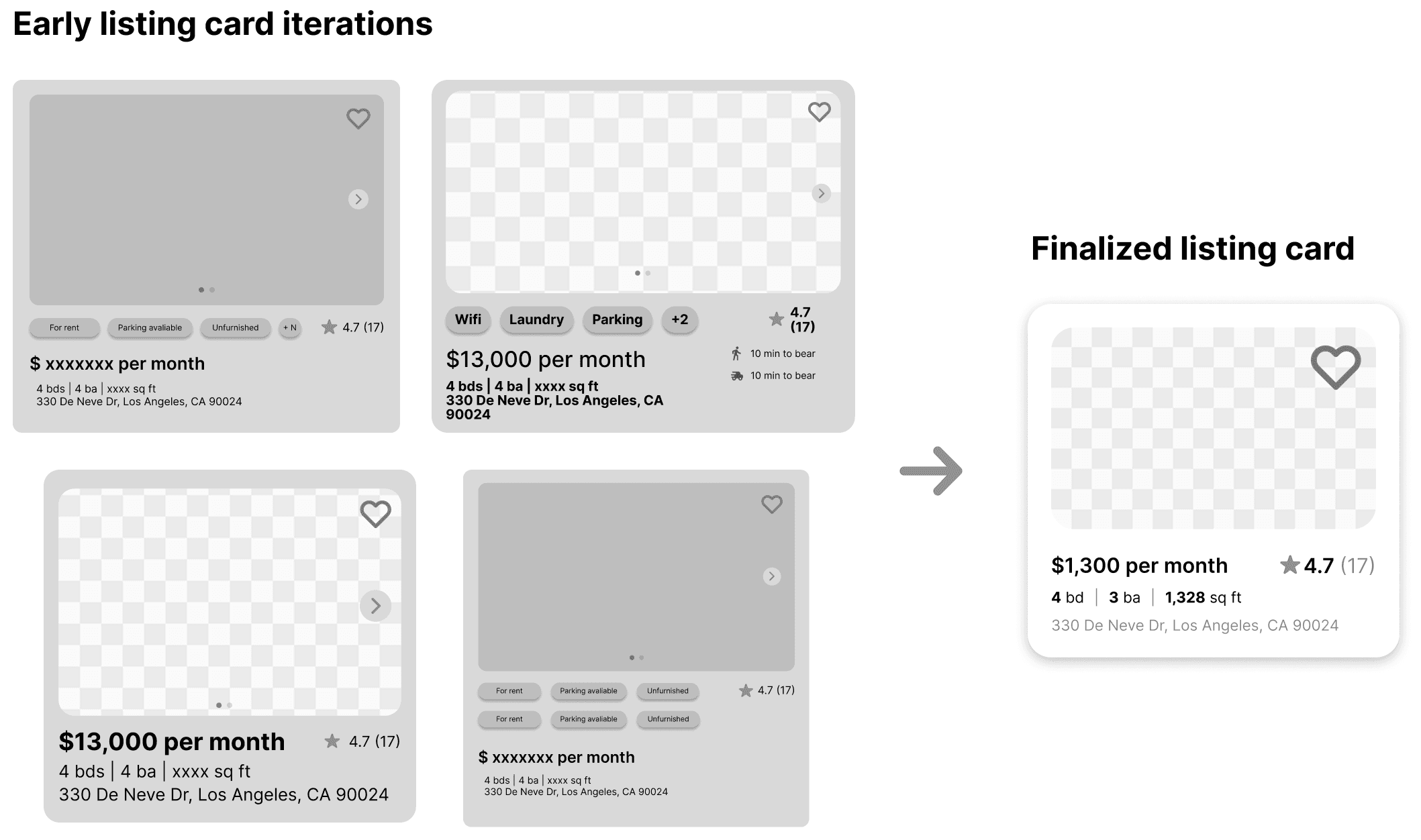 I explored multiple listing card iterations, moving away from early cluttered, text-heavy designs toward a more minimal, scannable layout.