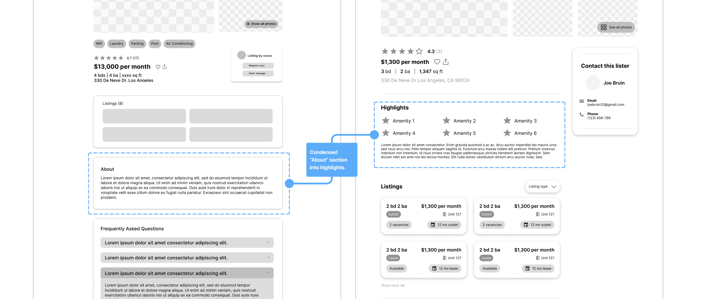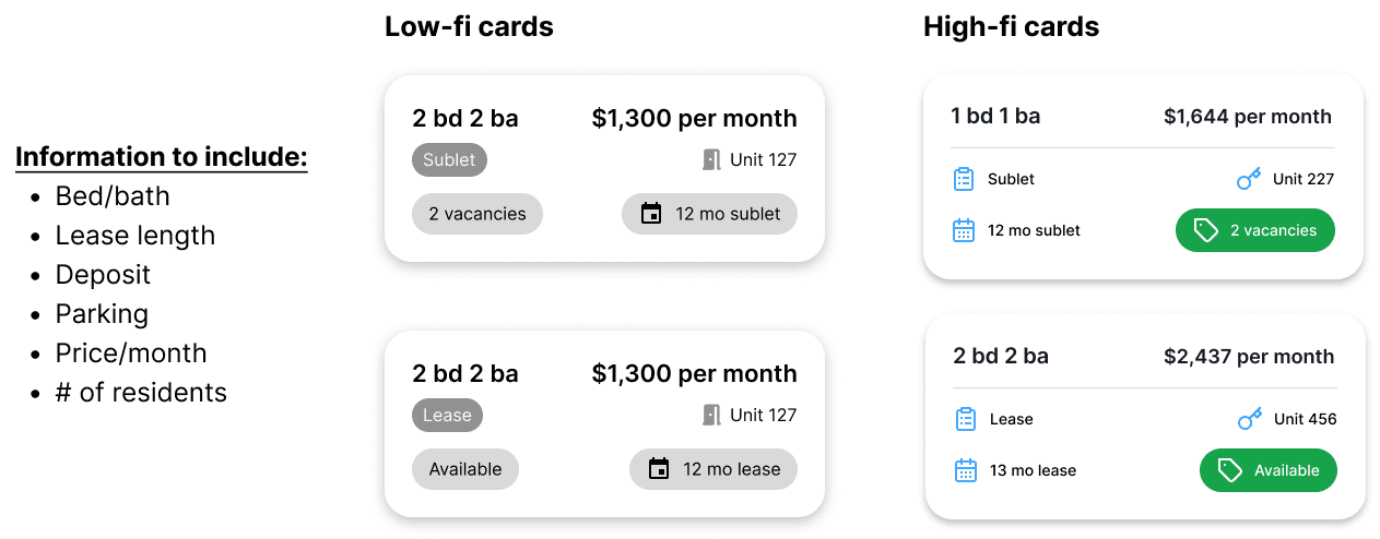 For the sublet card, I focused on clarity and digestibility, refining it into a clean, balanced component that highlights only essential information.